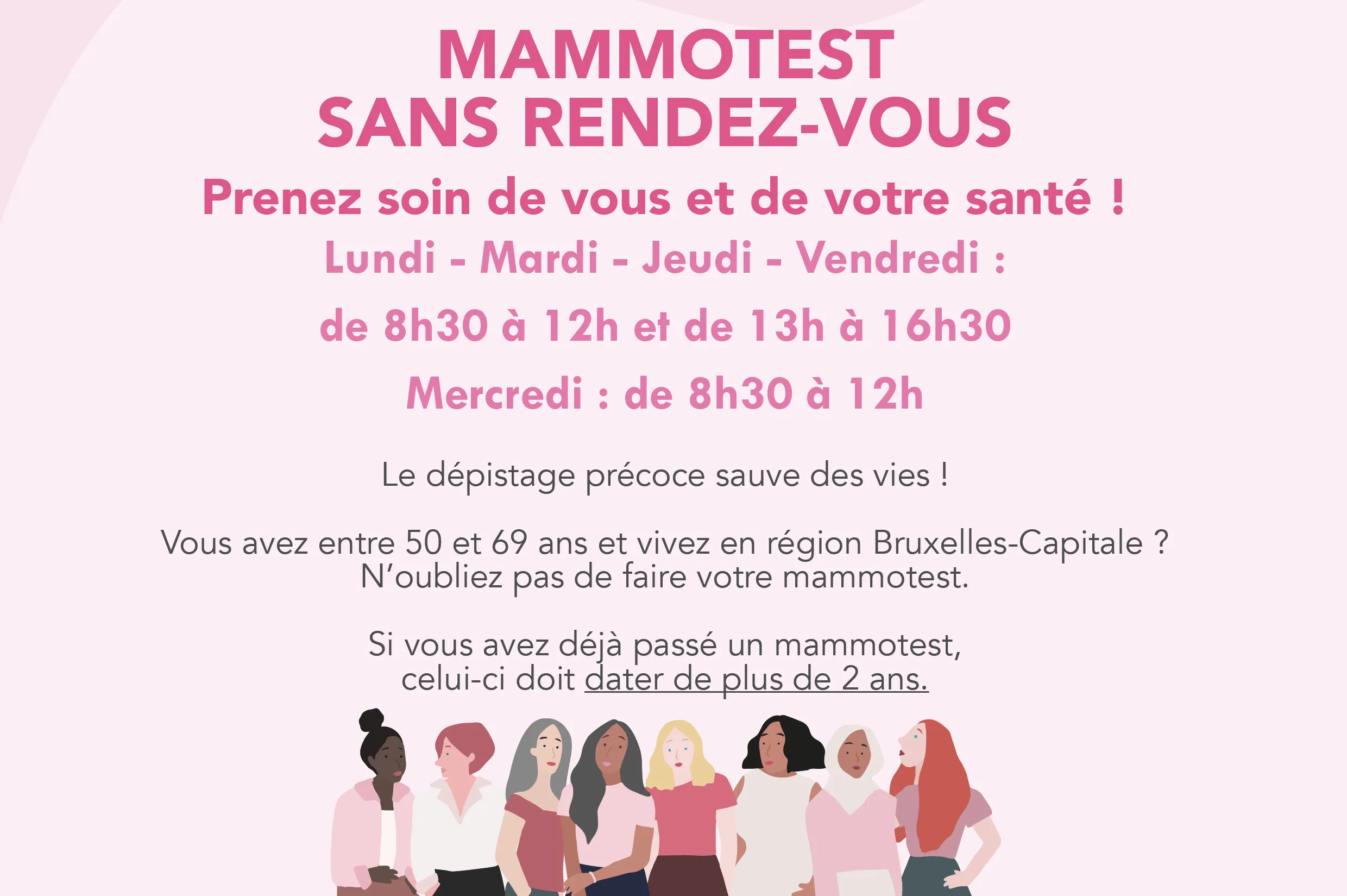 Vous avez entre 50 et 69 ans et vivez en région Bruxelles-Capitale ? N’oubliez pas de faire votre mammotest.