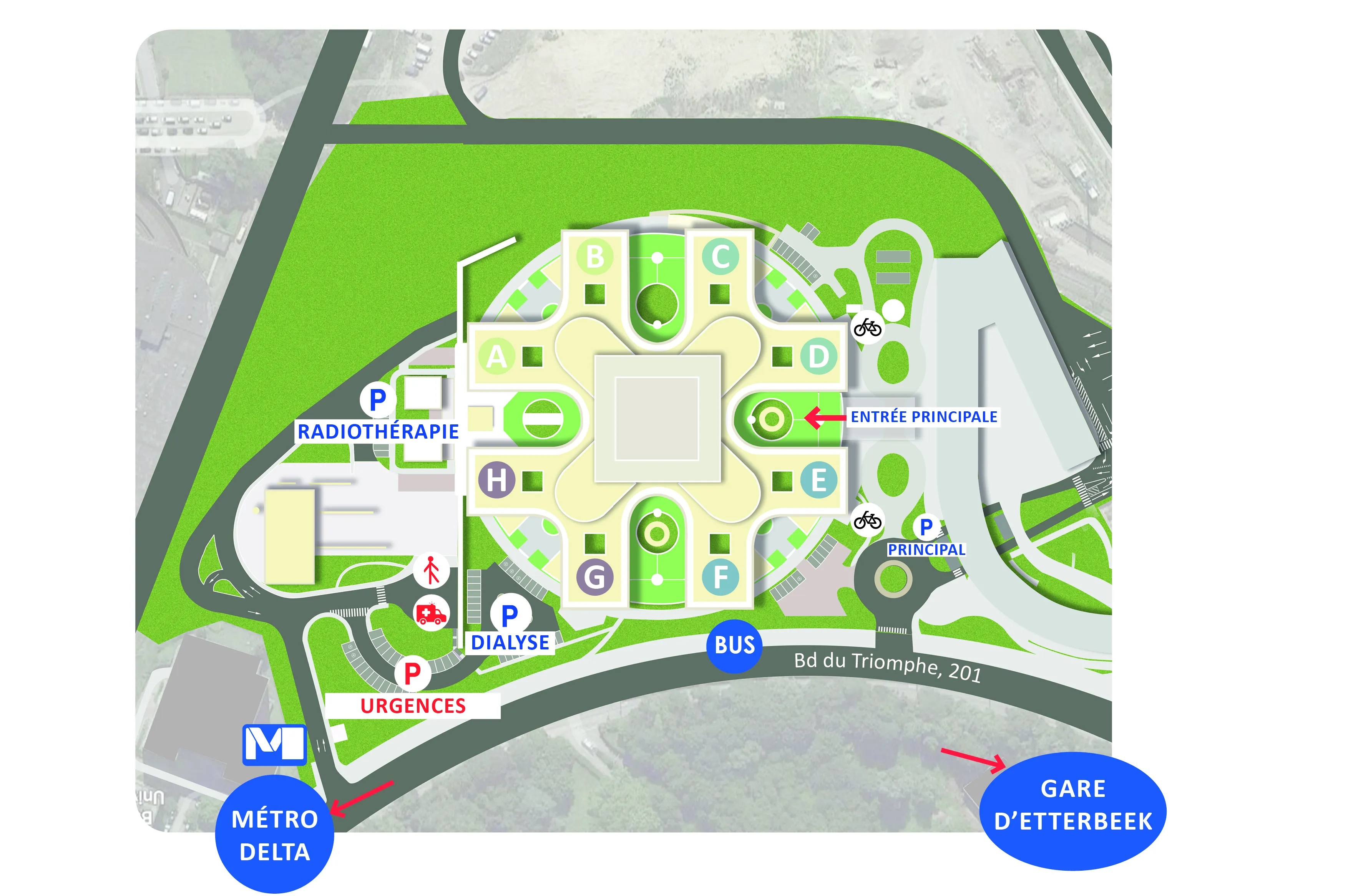 There are cycle racks at the hospital entrance and two Villo! stations nearby (station no. 311 - DELTA or station no. 116 - ULB PLAINE).
